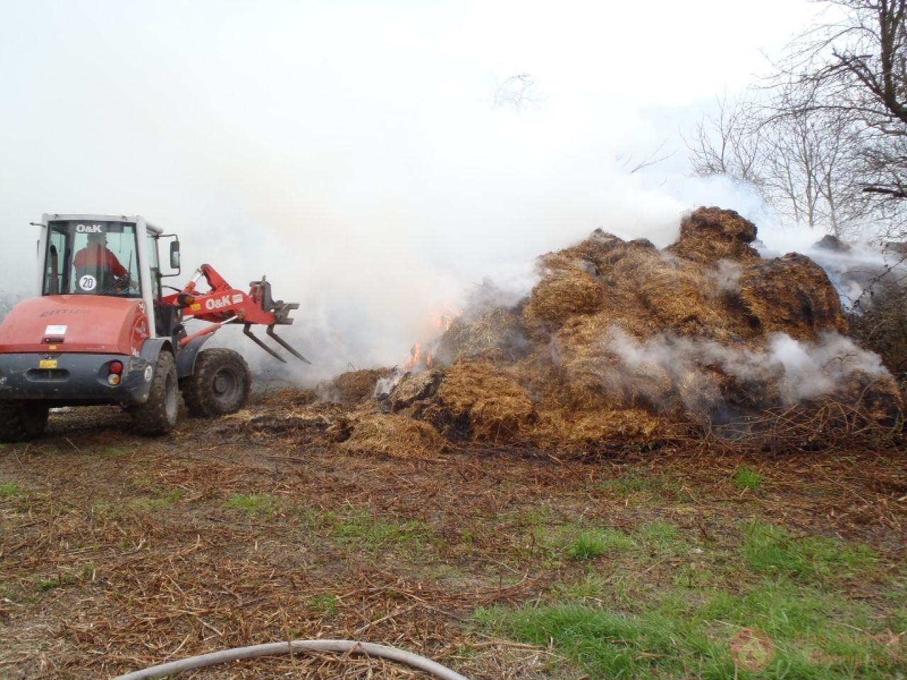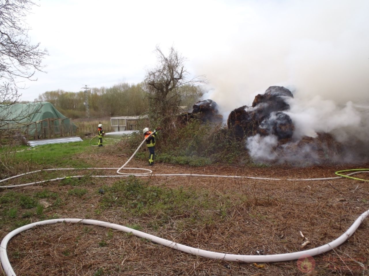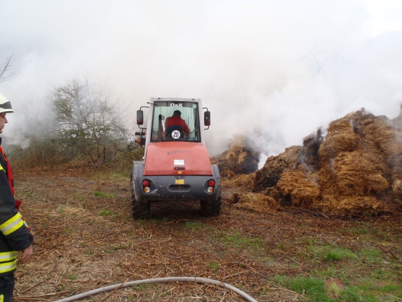 Als wir an der Einsatzstelle ankamen, stellten wir fest das auf einem Feld ca. 90 Strohballen branden. Mit 6 Strahlrohren wurde das Feuer von allen Seiten bekämpft um die Lage schnell wieder unter Kontrolle zu bringen. Das Material musste mit einem städtischen Radlader auseinander gezogen werden damit wir die Glutnester ablöschen konnten.