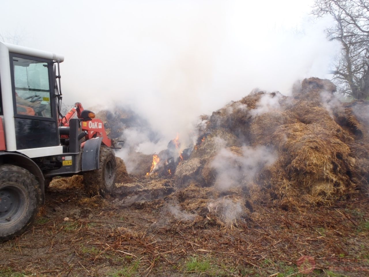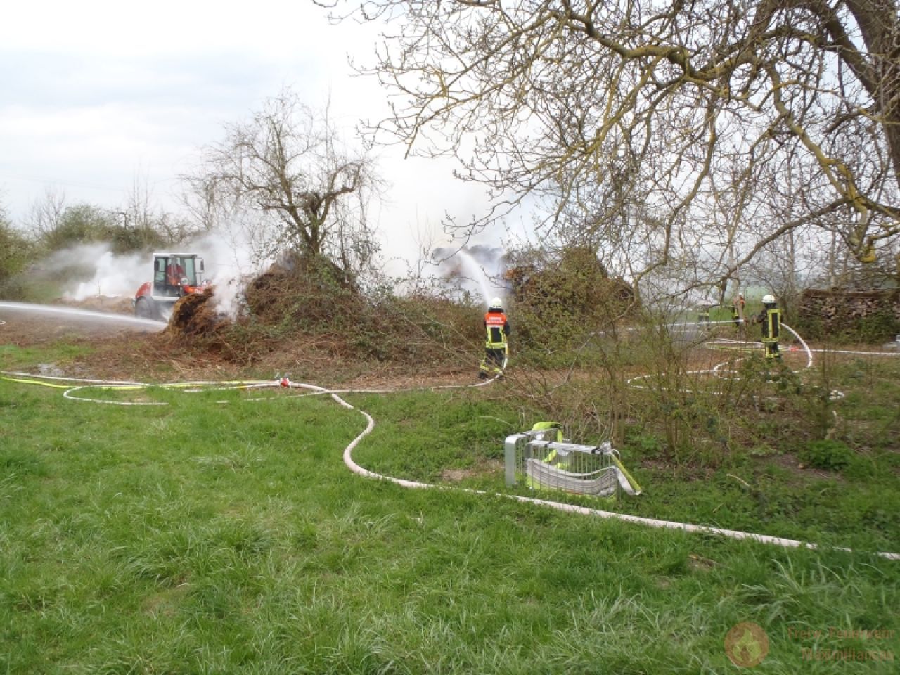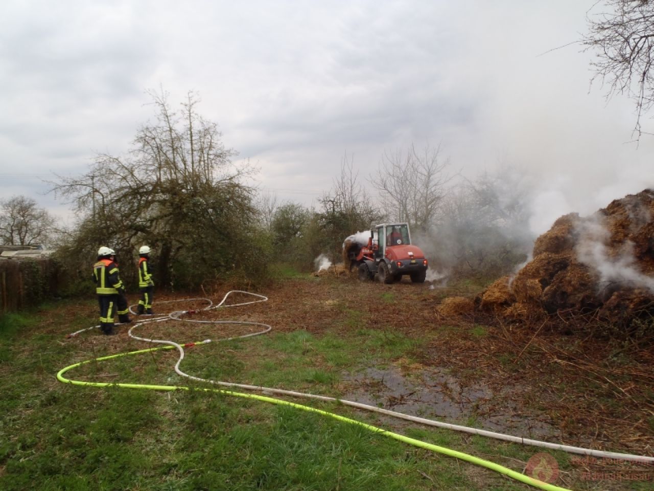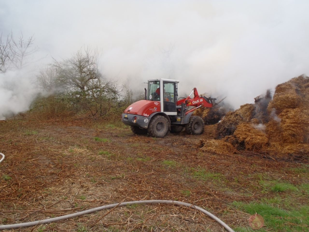 Als wir an der Einsatzstelle ankamen, stellten wir fest das auf einem Feld ca. 90 Strohballen branden. Mit 6 Strahlrohren wurde das Feuer von allen Seiten bekämpft um die Lage schnell wieder unter Kontrolle zu bringen. Das Material musste mit einem städtischen Radlader auseinander gezogen werden damit wir die Glutnester ablöschen konnten.