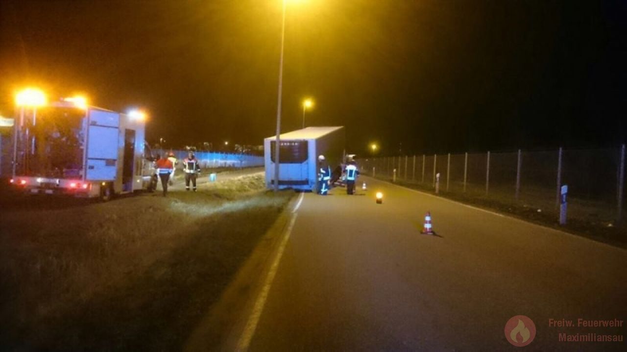 Am 02.03.2017 um 23:49 Uhr wurden wir in das Industriegebiet am Oberwald zu einem Verkehrsunfall mit ausgelaufenen Betriebsstoffen alarmiert. An einem Lkw hatte sich während der Fahrt der Auflieger abgelöst. Der Hänger rutschte über den Boden und kam wenige Meter später zum stehen. Durch uns wurde die Einsatzstelle abgesichert und auslaufende Betriebsmittel aufgefangen.