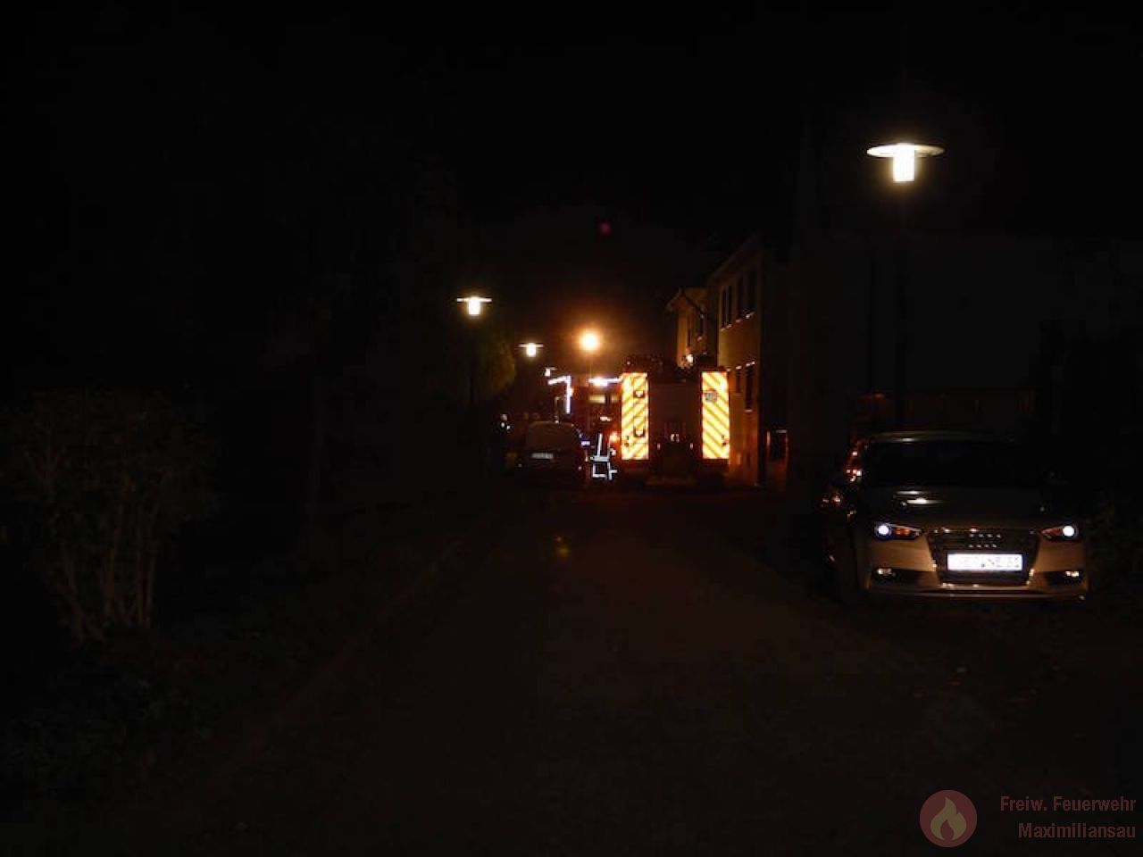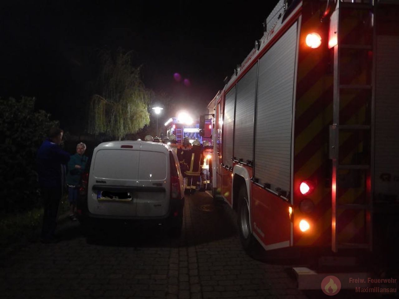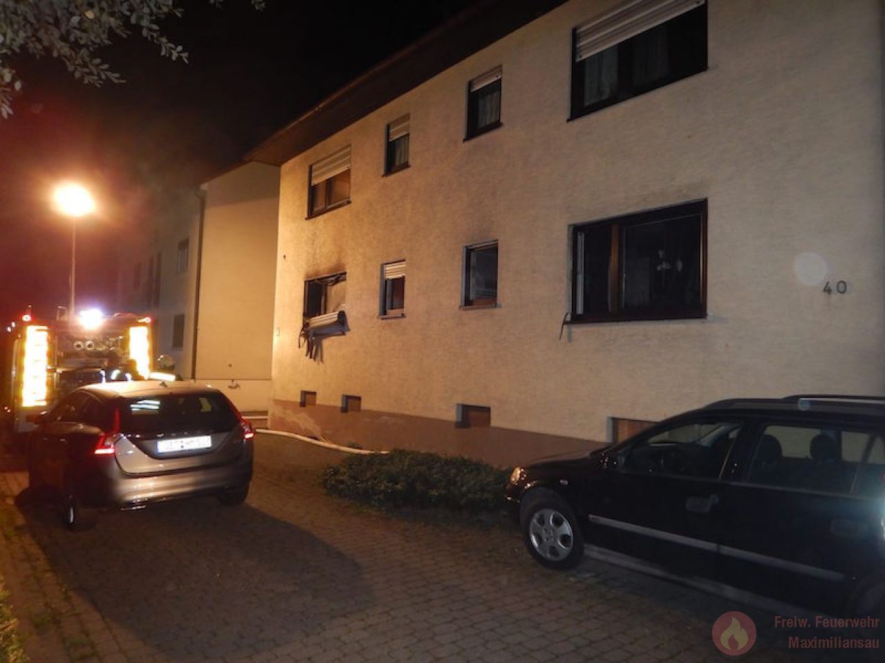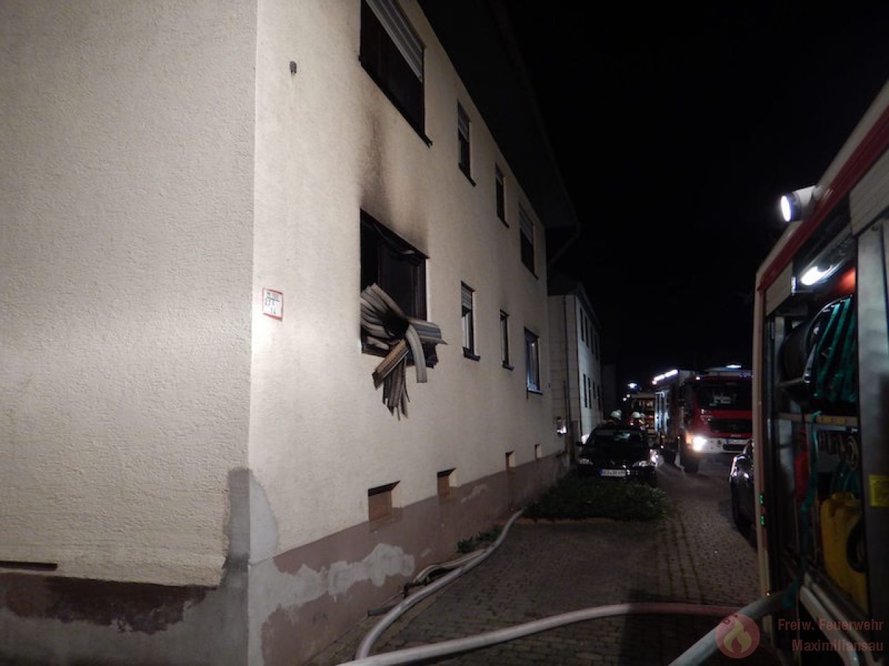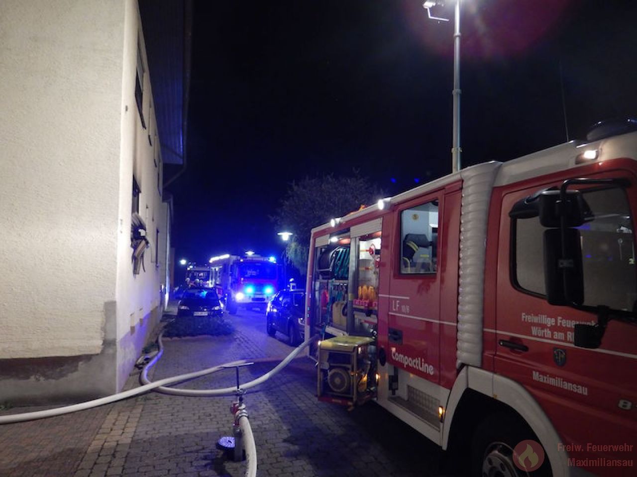 Am 26.09.2017 wurden wir um 20:56 Uhr, zusammen mit der Feuerwehr Wörth zu einem gemeldeten Küchenbrand im Ortsteil Maximiliansau alarmiert. Der Ernst der Lage wurde bereits auf der Anfahrt klar, da die Rettungsleitstelle bereits mehrere Notrufe von der Einsatzstelle meldete und somit von einem ausgedehnten Wohnungsbrand ausging. Bereits um 21:02Uhr meldete der Maximiliansauer Einsatzleiter Rainer Böser einen Brand in einer Erdgeschosswohnung, Personen sollten sich keine mehr im Gebäude befinden. Zügig gingen 2 Einsatzkräfte,unter Atemschutz, mit einem Strahlrohr in die Wohnung zur Brandbekämpfung vor. Den Einsatzkräften gelang es einen Hund lebend aus der Wohnung zu retten, für 2 weitere Tiere kam leider jede Hilfe zu spät. Bereits um 21:10 Uhr, also 8 Minuten nach dem eintreffen, konnte „Feuer aus“ gemeldet werden. 4 Personen die sich vor unserer Ankunft selbst in Sicherheit bringen konnten wurden vorsorglich durch den Rettungsdienst behandelt. Die Brandwohnung ist zur Zeit unbewohnbar, 2 weitere Wohnungen wurden durch uns belüftet und frei gemessen.