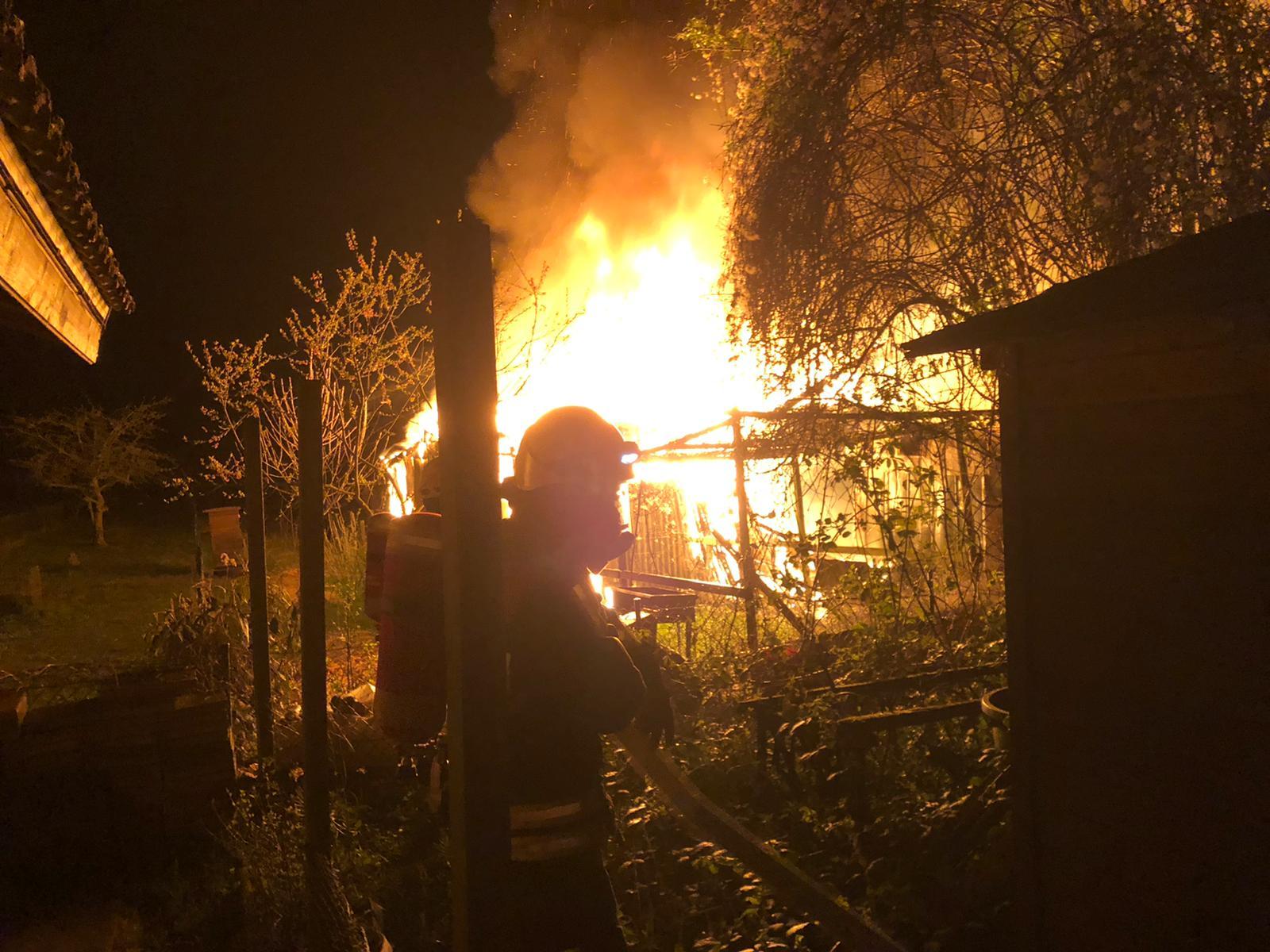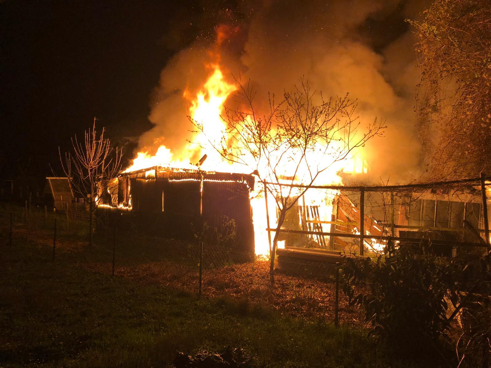 Am 31.03.2020 wurden wir um 22:02 Uhr zusammen mit der Feuerwehr Wörth zu einem gemeldeten Brand einer Gartenhütte alarmiert. Bereits beim eintreffen an der Einsatzstelle, meldete der Einsatzleiter den Vollbrand einer größeren Gartenhütte samt nebenstehender Anbauten. Da die Hütte bereits den Flammen zum Opfer gefallen war, bestand unsere erste Maßname darin, die Ausbreitung auf weitere neben der Hütte stehende Bauten bzw. auf einen Wohnwagen mit Vorzelt zu verhindern. Zur Brandbekämpfung und wegen des starken Funkenregens waren bis zu 5 Strahlrohre gleichzeitig im Einsatz. Der Brand konnte durch mehrere Trupps unter Atemschutz gelöscht werden. Im Laufe des Einsatzes konnte durch den Angriffstrupp eine Propangas-Flasche gesichert werden, die sich zuvor noch im Brandobjekt befand! Bei den Löscharbeiten wurde eine Einsatzkraft leicht verletzt. Der Einsatz war gegen 1 Uhr beendet.