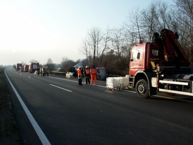 Kurzbericht: | Am Morgen wurde der Gefahrstoffzug des Landkreis Germersheim, dem auch die Einheit Maximiliansau angehört, alarmiert. Ein mit leichter Säure beladener LKW war auf der Bundesstraße 9 umgekippt und leckgeschlagen. Daraufhin sammelten sich die dem Gafahrstoffzug angehörigen Einheiten der Satdt Wörth im Gerätehaus in Wörth und rückten gemeinsam zur Einsatzstelle aus. Dort angekommen wurde die Einsatzstelle weiträumig gesichert und mittels Leckpaste das Leck im Tankauflieger verschlossen. Anschließend wurde die noch im Tankauflieger verbliebene Flüssigkeit in ein Ersatzfahrzeug umgepumpt und der verunfallte LKW samt auflieger geborgen. |