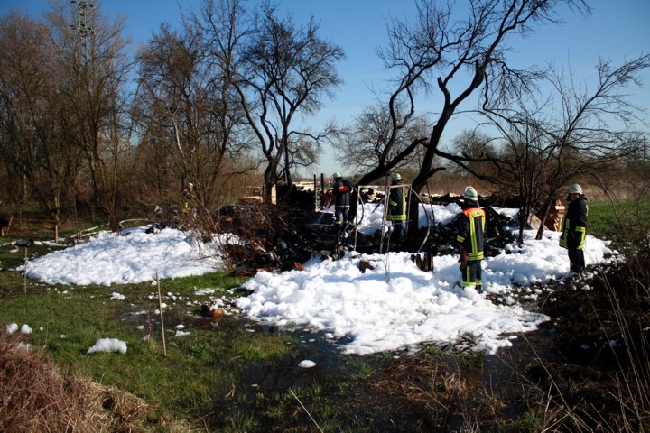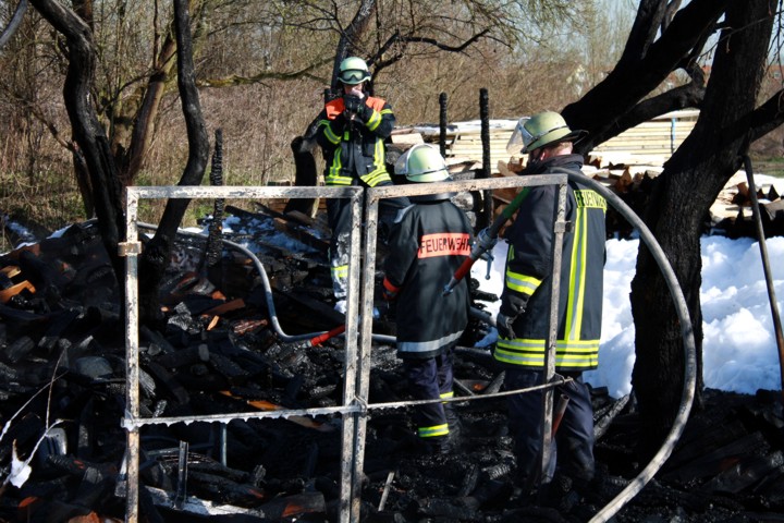 Kurzbericht: | Besorgte Spaziergänger riefen am Morgen die Feuerwehr erneut zur noch immer rauchenden Einsatzstelle von der Nacht. Durch den Schaum der noch immer die gesamte Fläche bedeckte stieg an vereinzelten Stellen Rauch empor. An diesen Stellen wurde nun das Brandgut umgeschichtet und nochmals nachgelöscht. |