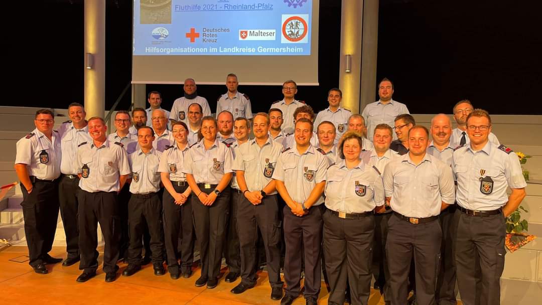 In einem feierlichem Rahmen verlieh Landrat Dr. Fritz Brechtel zusammen mit Vertretern der Blaulichtfamilie gestern Abend die Dankmedaille des Landes Rheinland-Pfalz für die im Ahrtal eingesetzten Rettungskräfte von Feuerwehr, THW, DRK und des Malteser Hilfsdienstes