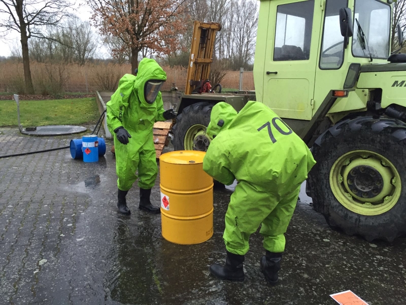 Angenommen wurde ein Unfall an der dortigen Kläranlage, bei dem unbekannte Flüssigkeiten austraten. Die Aufgabe war es, in Gefahr geratene Personen zu finden und schnellstmöglich zu retten. Danach konnten die Gefahrstoffe identifiziert und weitere Maßnahmen durchgeführt werden: Um eine weitere Ausbreitung der flüssigen Stoffe zu vermeiden, wurden Auffangbehälter und Materialien zum Abdichten der Leckagen verwendet. Nun war es möglich, die ausgetretenen Stoffe umzupumpen.